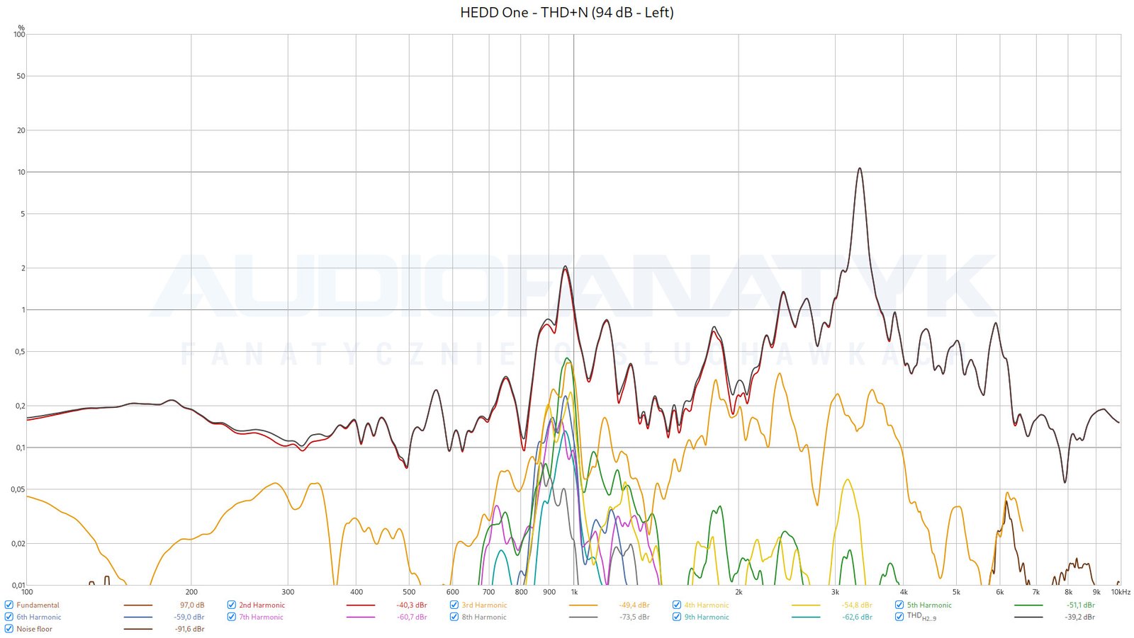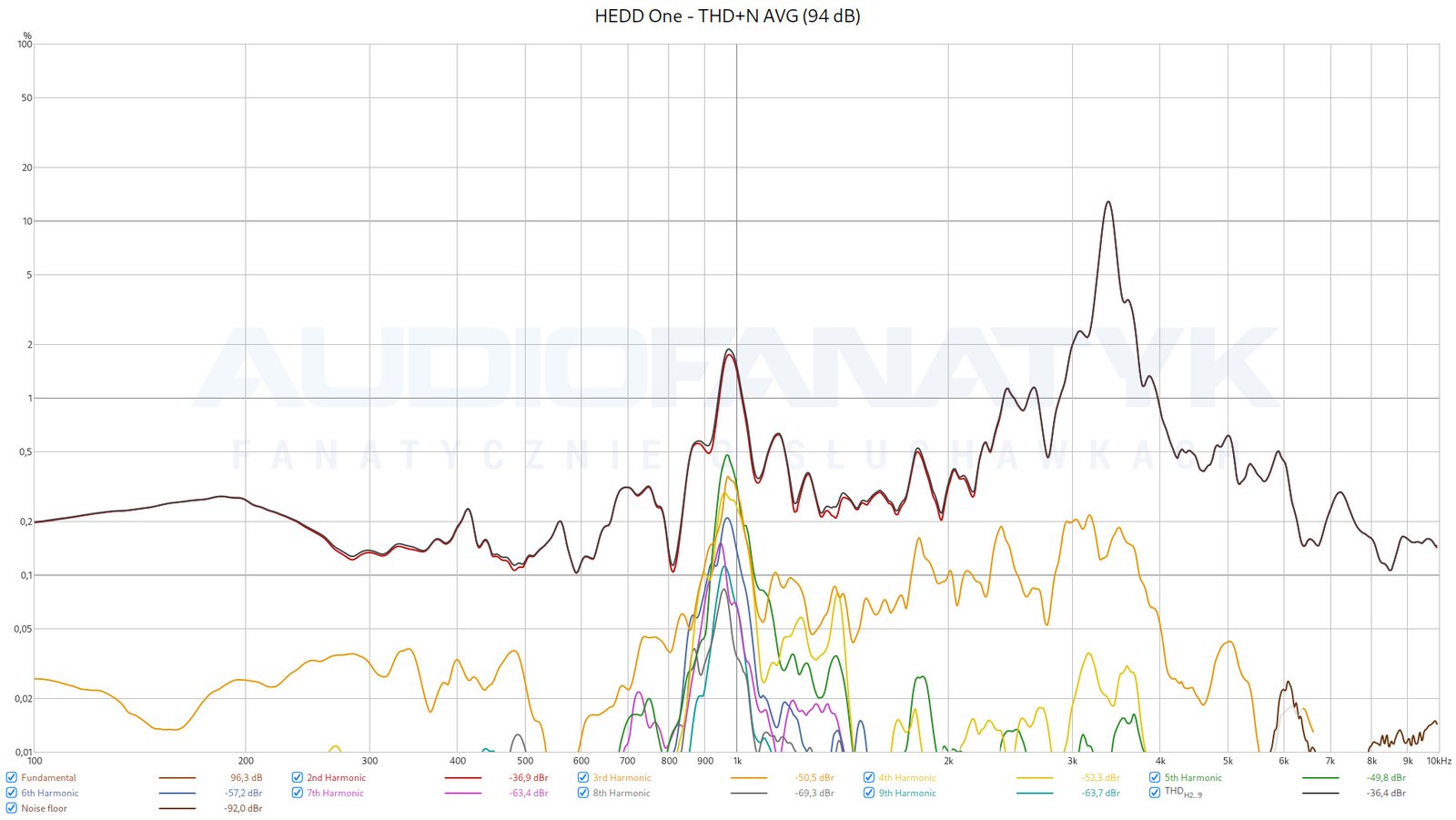 Po pierwsze, słuchawki „skończą się” znacznie szybciej niż tor audio. Przy tak dużych zniekształceniach HEDDy będą najsłabszym ogniwem w ogromnej większości torów. Przy 94 dB SPL nie schodzą w żadnym punkcie pasma poniżej 0,1% THD+N (-60 dB). Nie są zatem w stanie fizycznie pokazać czegokolwiek powyżej tego pułapu.