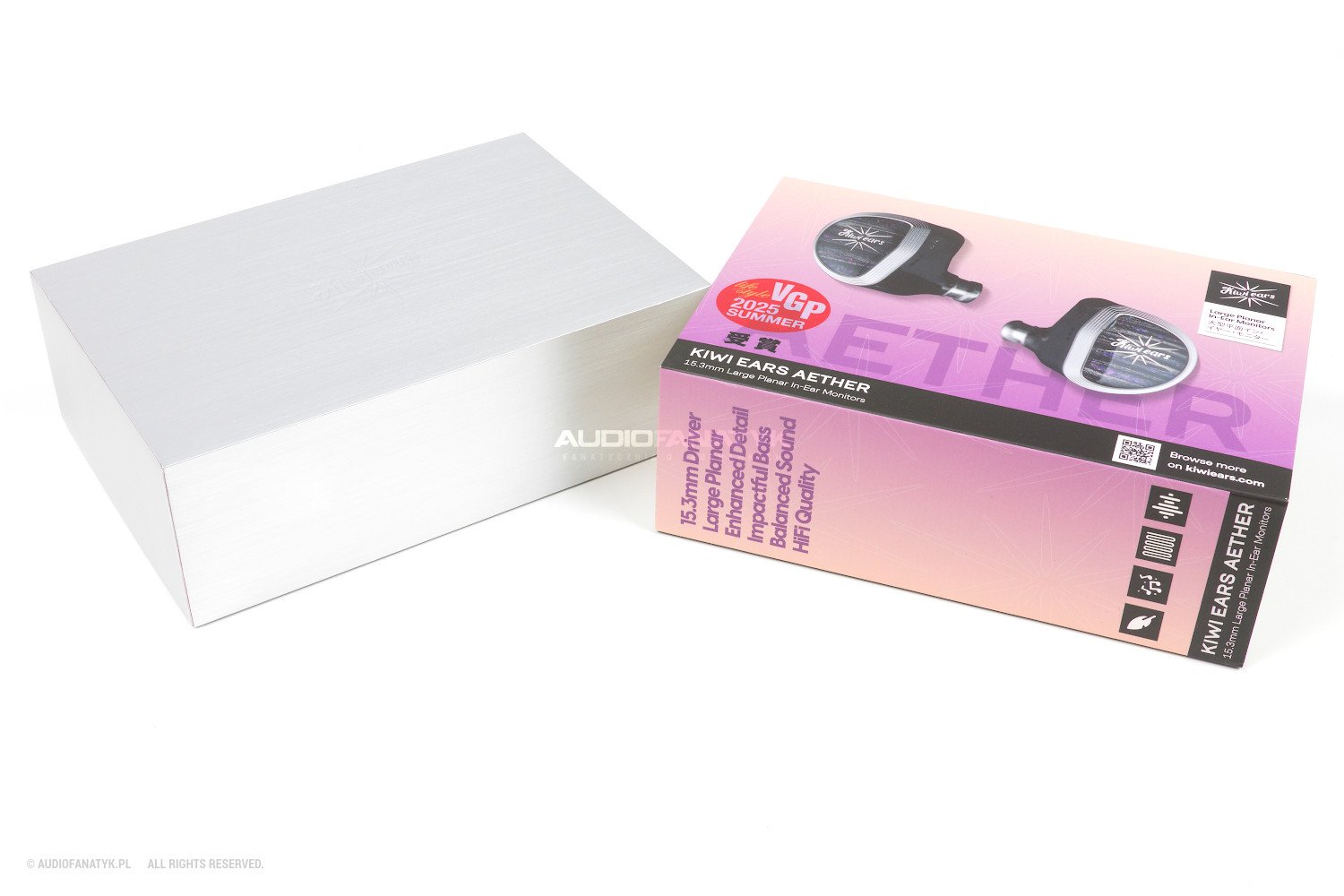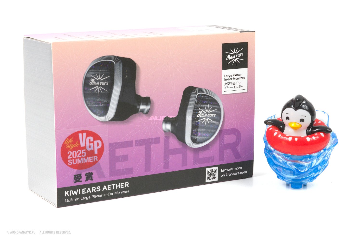 Kiwi Ears Aether są przedstawicielami słuchawek magnetostatycznych, gdzie producent chwali się zastosowaniem 15,3 mm przetwornika. Chwali się przy tym na pudełku takimi cechami, jak: