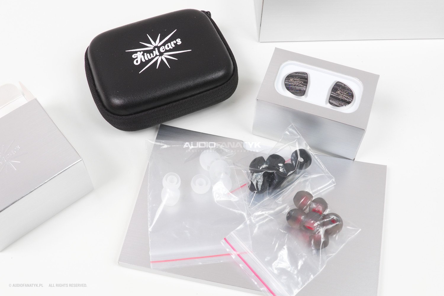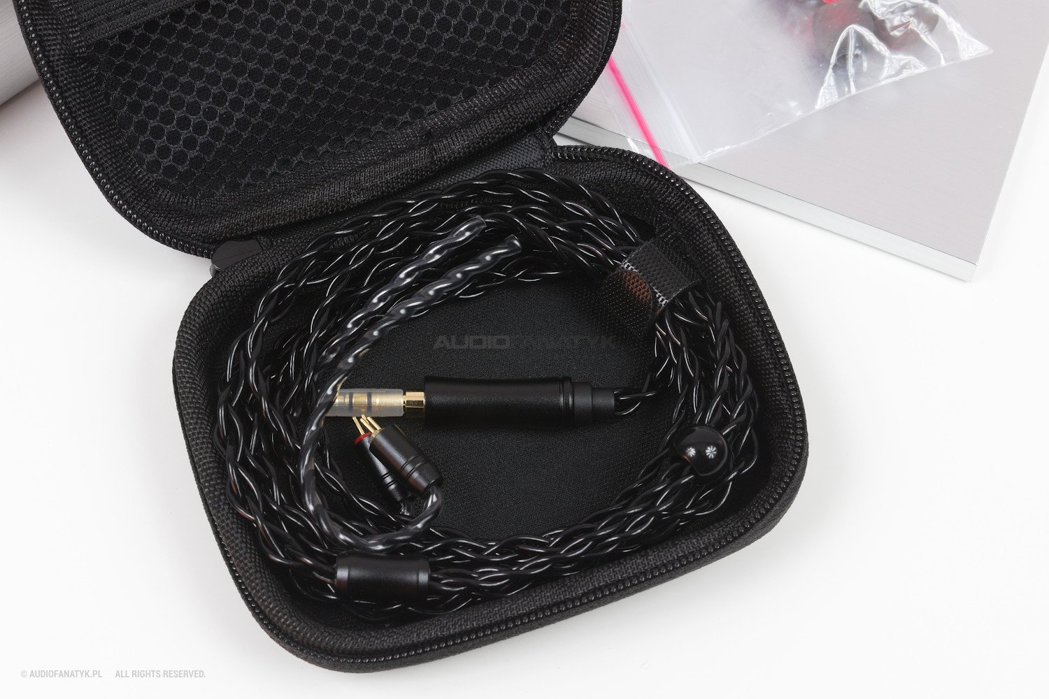 Generalnie jakież wyposażenie mamy – każdy widzi. Twarde etui z resztkami farby (?) po logotypie na nie naniesionym (?), zaplatany kabelek, komplet tipsów. Jedynie na kabelek zwróciłem uwagę, bo bardzo łatwo można go rozplątać (oczka są stosunkowo luźne). W zestawie mamy tylko wersję na jack 3,5 mm, ale jest ona wystarczająca przy parametrach Kiwi Ears Aether.