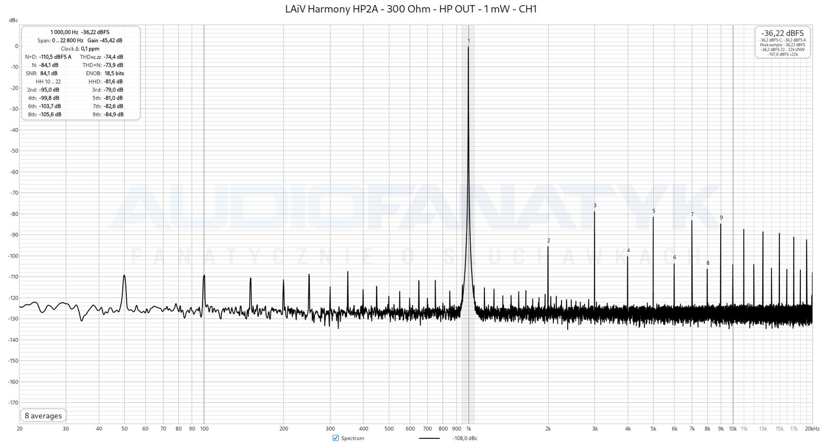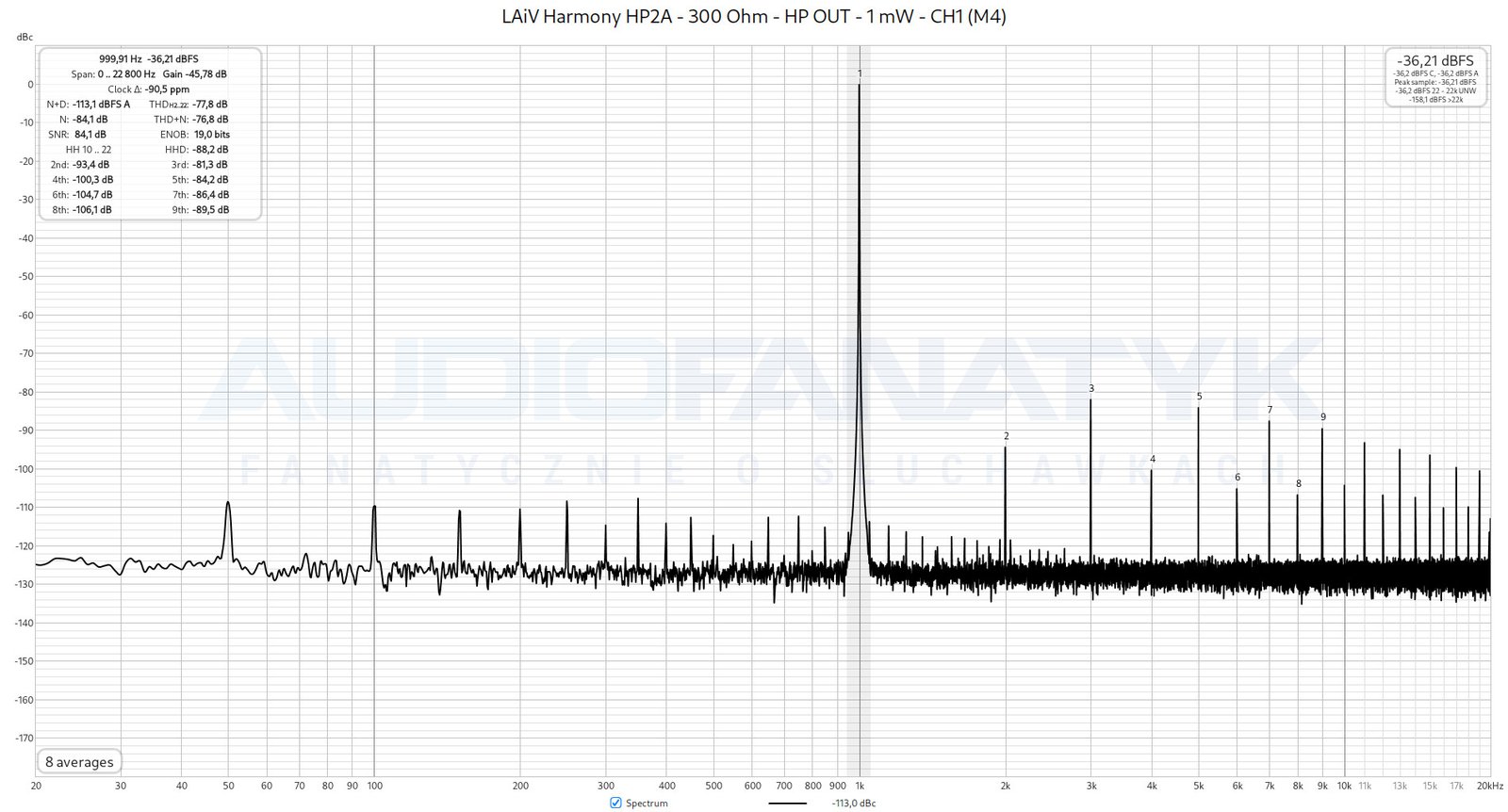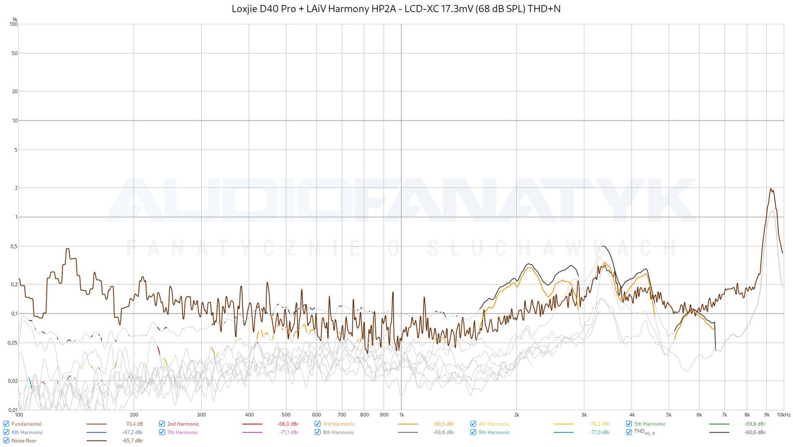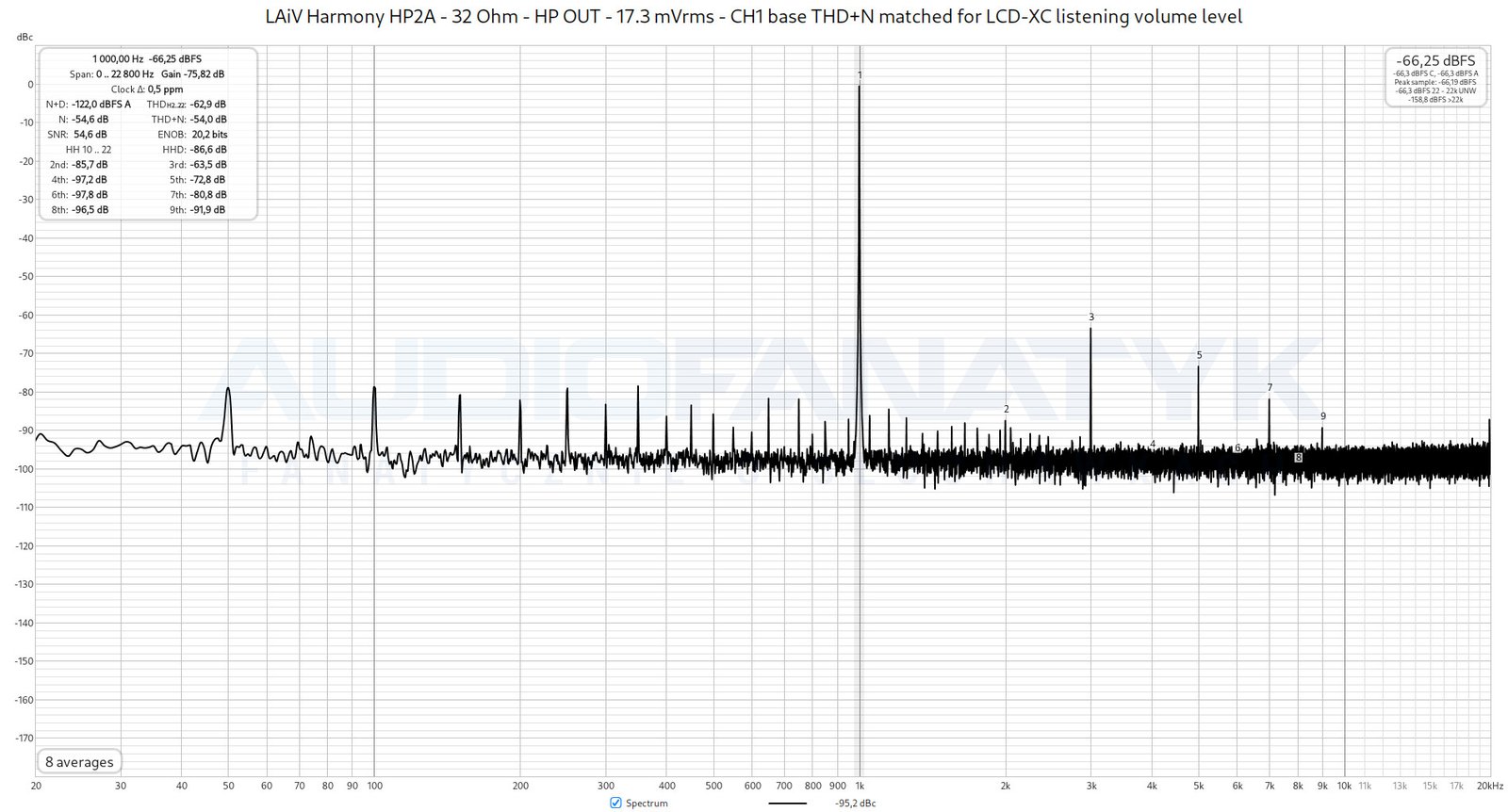 Moje domysły, że LAiV Harmony HP2A jest dedykowanym rozwiązaniem dla zamożnego audiofila z odpowiedniej klasy słuchawkami, wynikają właśnie z odsłuchów na LCD-XC. Jak pisałem, miałem w nich przeświadczenie pewnej surowości w dźwięku. Takiej, którą o dziwo nawet słychać. I nie myliłem się – wykonane badania i pomiary rzeczywiście wskazują na podkreślenie trzeciej harmonicznej do granicy subtelnego wrażenia. Co więcej, przy 68 dB SPL okazało się, że wzmacniacz serwuje zniekształcenia na poziomie zbliżającym się miejscami do 0,5%. Przy czułym uchu może to już być (bardzo subtelnie) słyszalne, choć brakuje mu jeszcze do oficjalnie uznawanej granicy 1%. A więc typowej lampy.