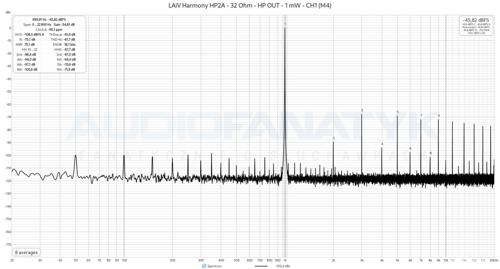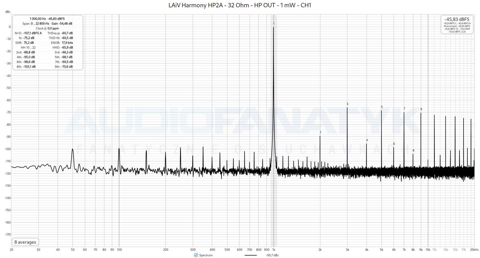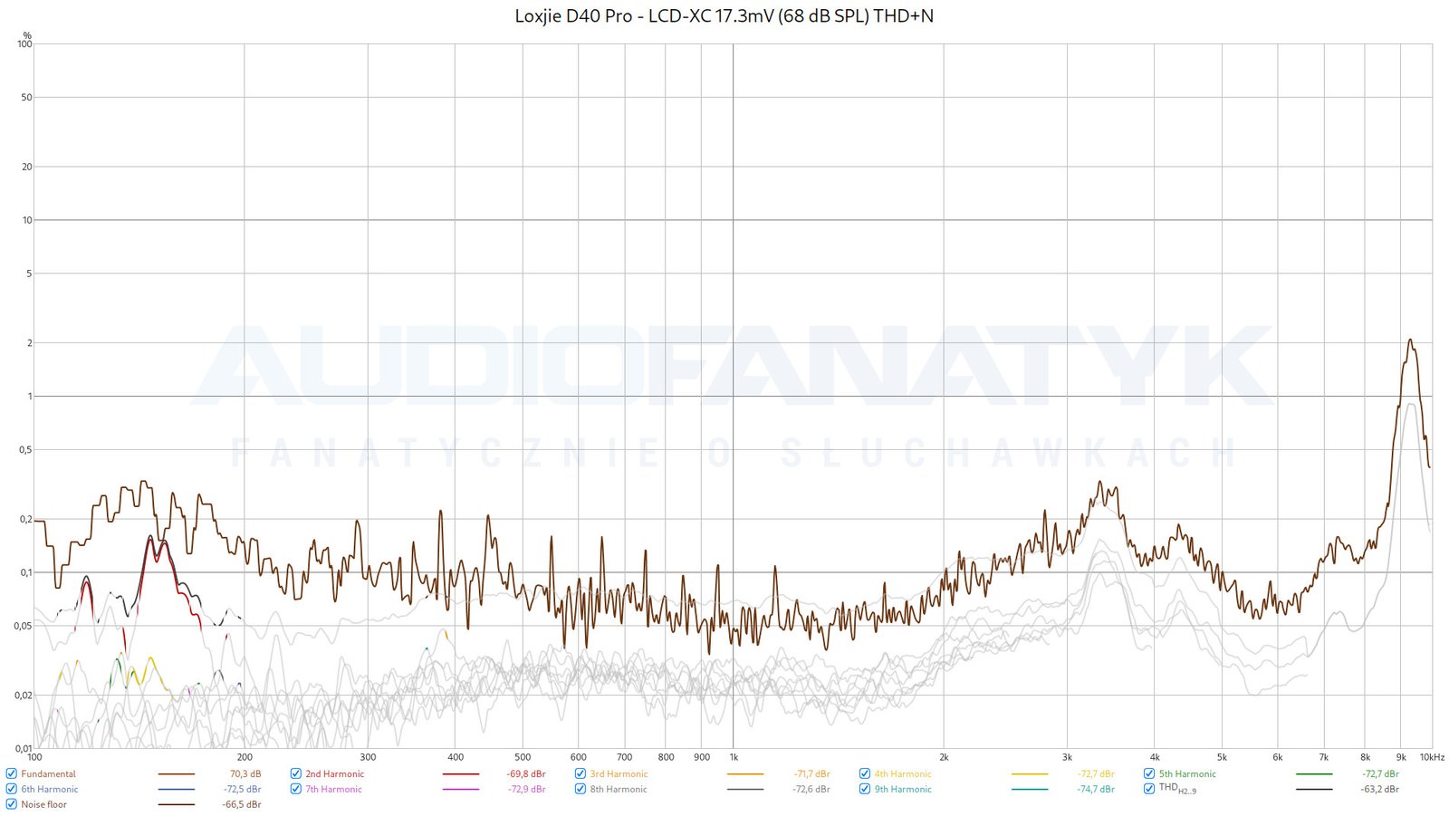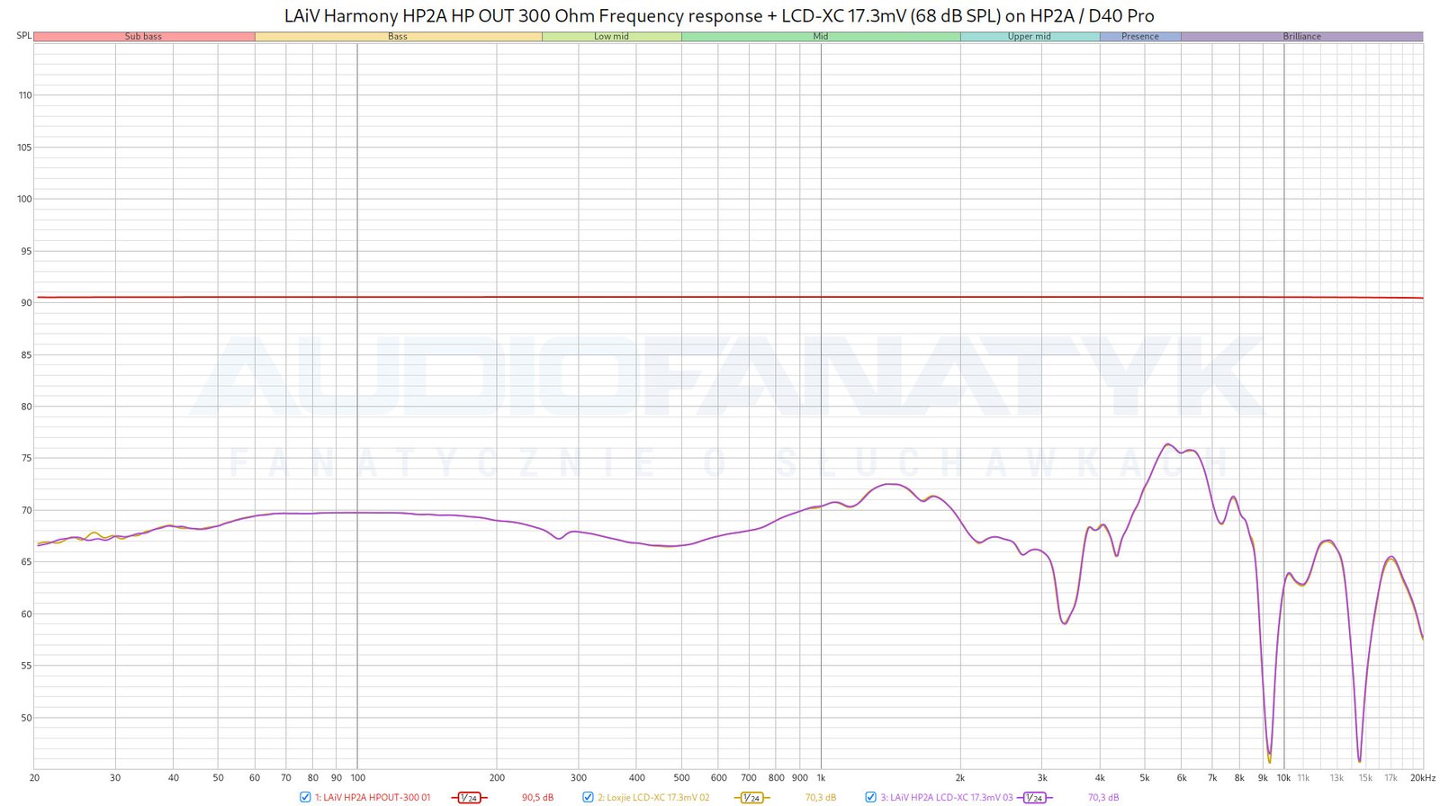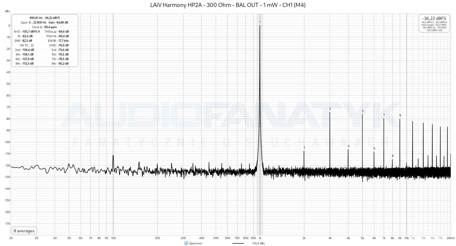 Moje domysły, że LAiV Harmony HP2A jest dedykowanym rozwiązaniem dla zamożnego audiofila z odpowiedniej klasy słuchawkami, wynikają właśnie z odsłuchów na LCD-XC. Jak pisałem, miałem w nich przeświadczenie pewnej surowości w dźwięku. Takiej, którą o dziwo nawet słychać. I nie myliłem się – wykonane badania i pomiary rzeczywiście wskazują na podkreślenie trzeciej harmonicznej do granicy subtelnego wrażenia. Co więcej, przy 68 dB SPL okazało się, że wzmacniacz serwuje zniekształcenia na poziomie zbliżającym się miejscami do 0,5%. Przy czułym uchu może to już być (bardzo subtelnie) słyszalne, choć brakuje mu jeszcze do oficjalnie uznawanej granicy 1%. A więc typowej lampy.