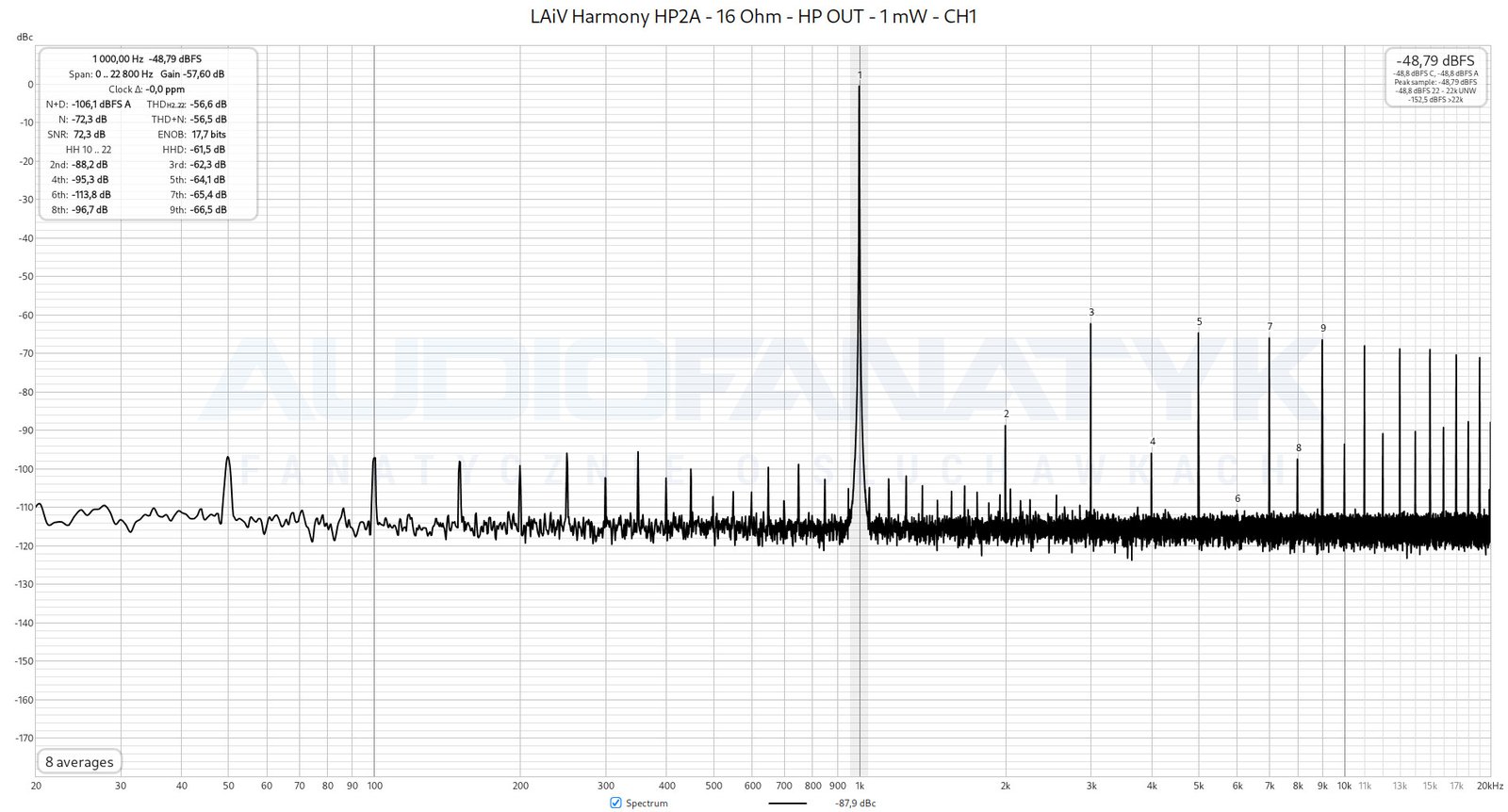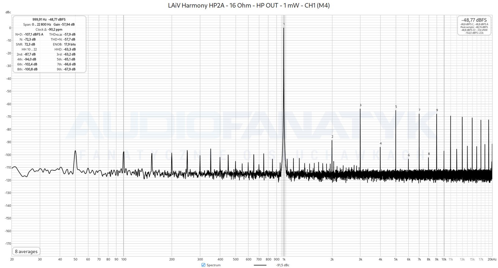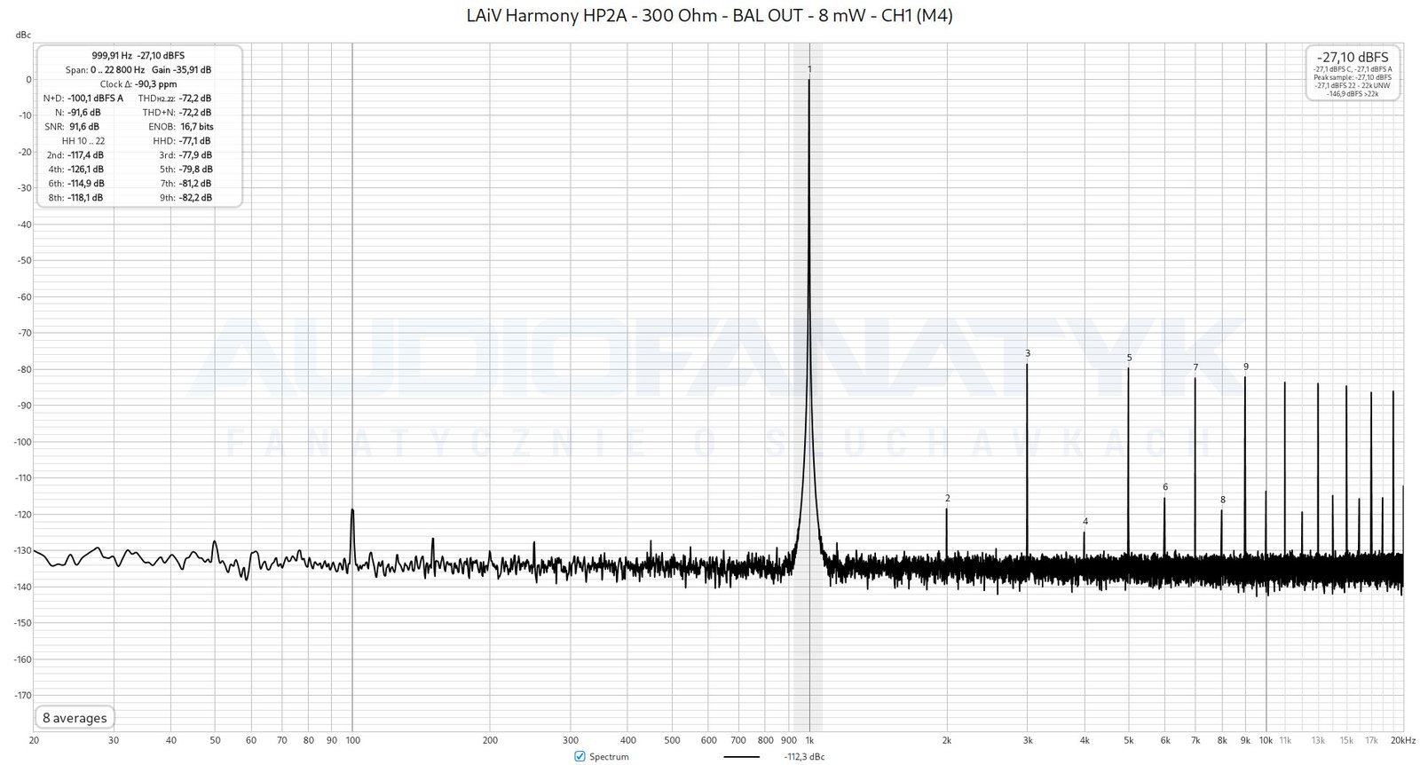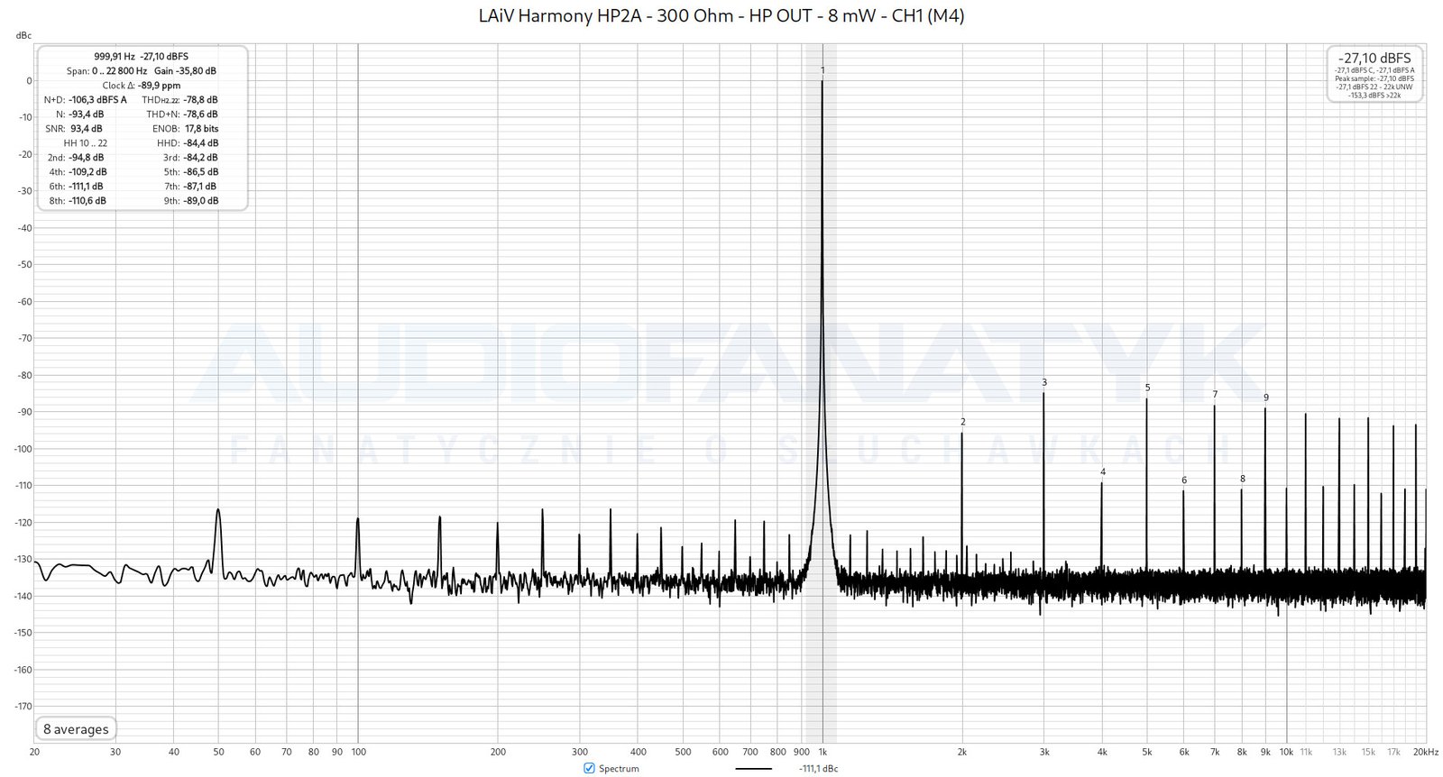 Moje domysły, że LAiV Harmony HP2A jest dedykowanym rozwiązaniem dla zamożnego audiofila z odpowiedniej klasy słuchawkami, wynikają właśnie z odsłuchów na LCD-XC. Jak pisałem, miałem w nich przeświadczenie pewnej surowości w dźwięku. Takiej, którą o dziwo nawet słychać. I nie myliłem się – wykonane badania i pomiary rzeczywiście wskazują na podkreślenie trzeciej harmonicznej do granicy subtelnego wrażenia. Co więcej, przy 68 dB SPL okazało się, że wzmacniacz serwuje zniekształcenia na poziomie zbliżającym się miejscami do 0,5%. Przy czułym uchu może to już być (bardzo subtelnie) słyszalne, choć brakuje mu jeszcze do oficjalnie uznawanej granicy 1%. A więc typowej lampy.