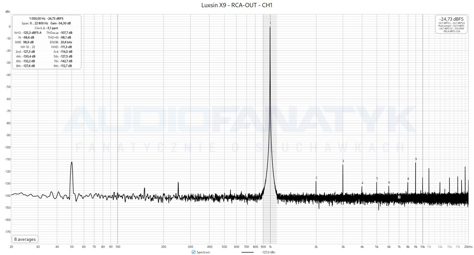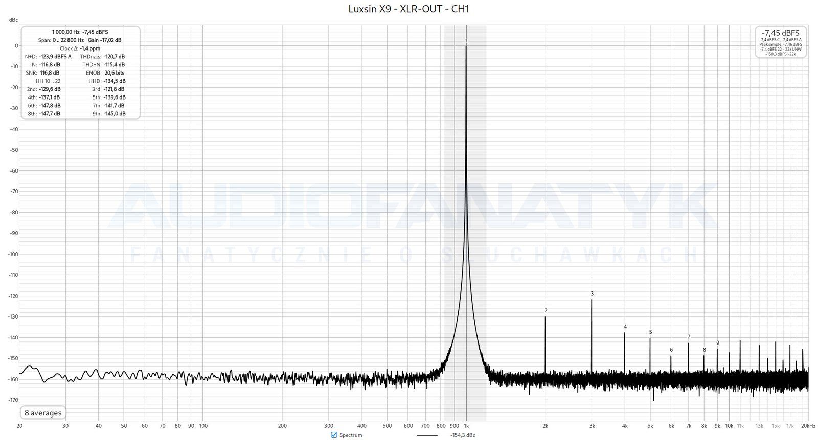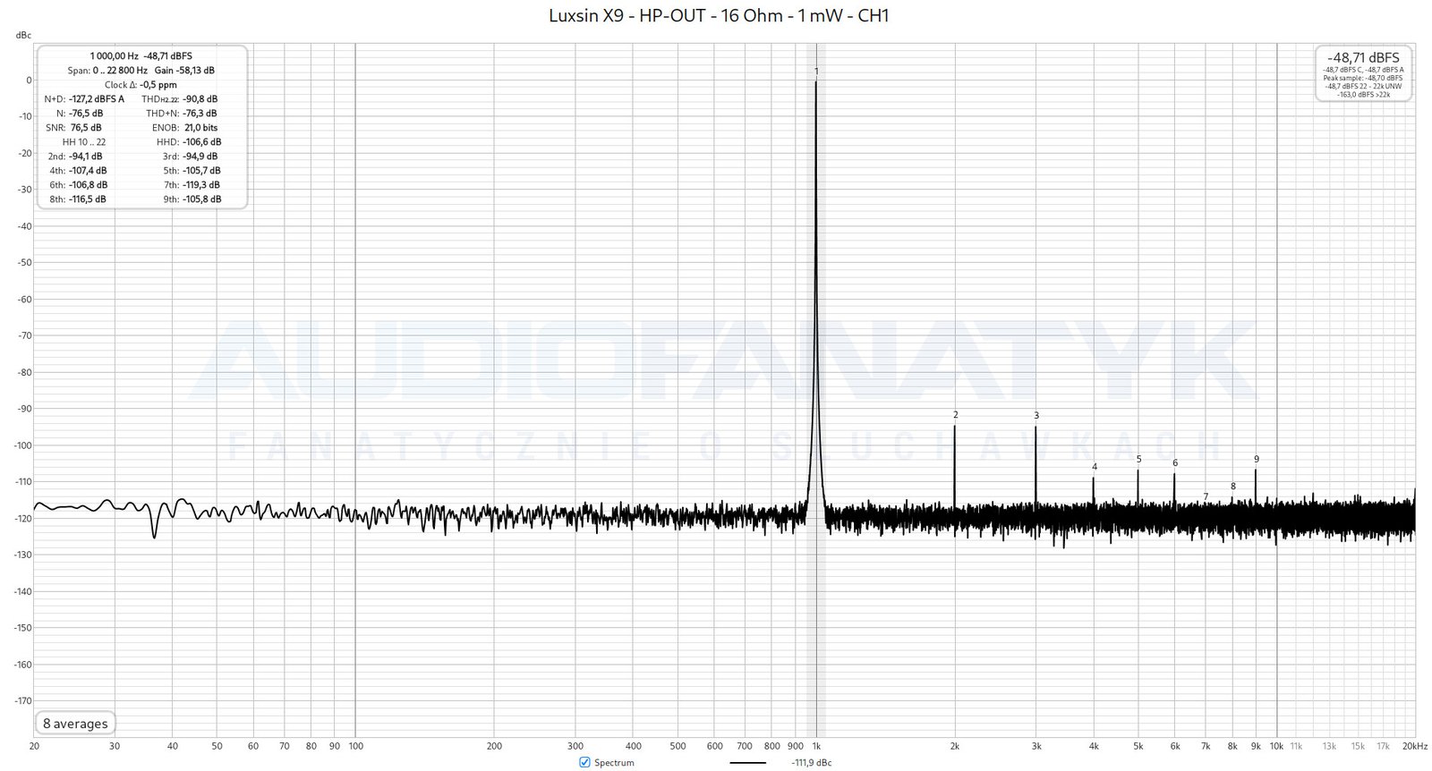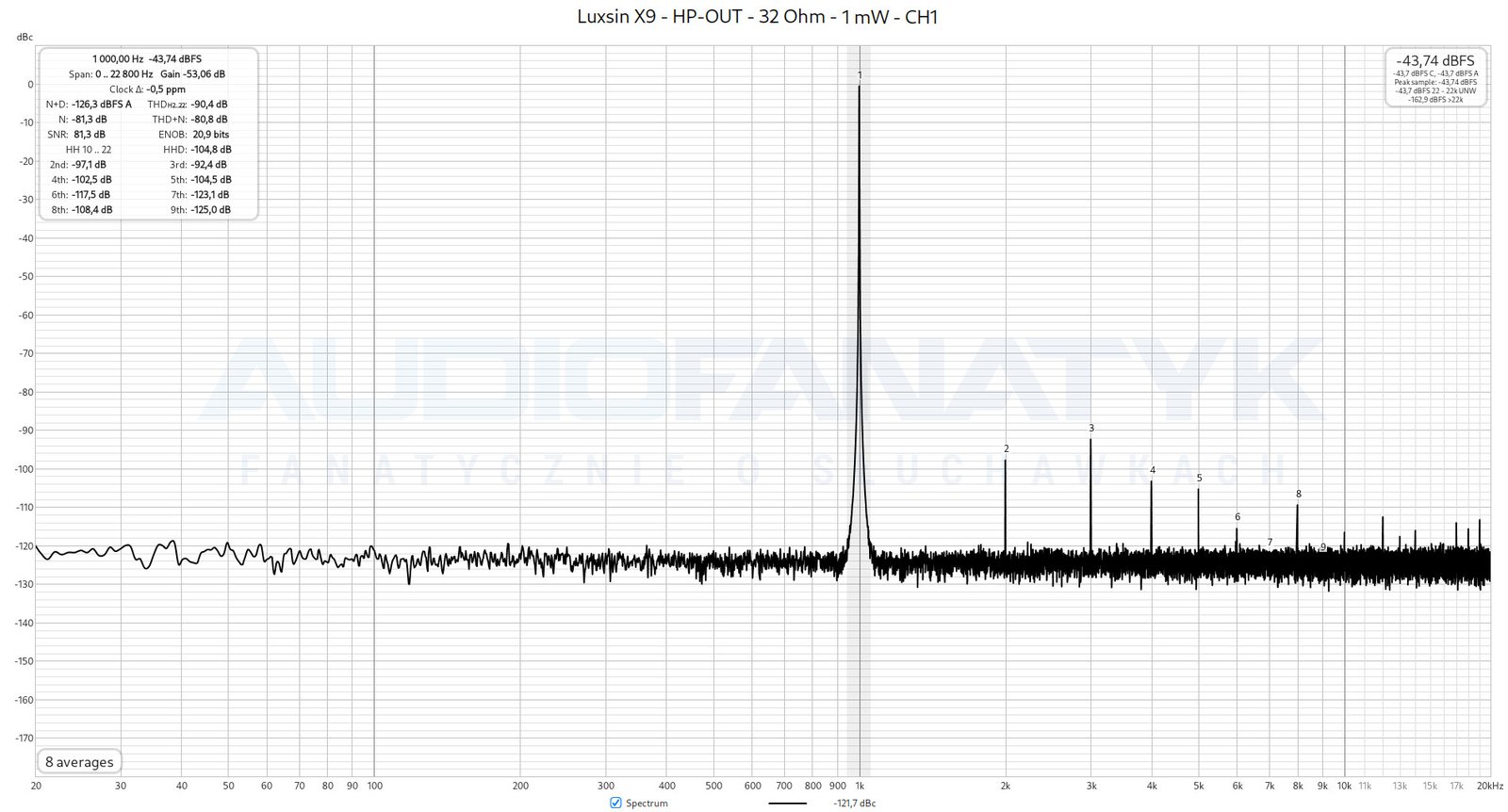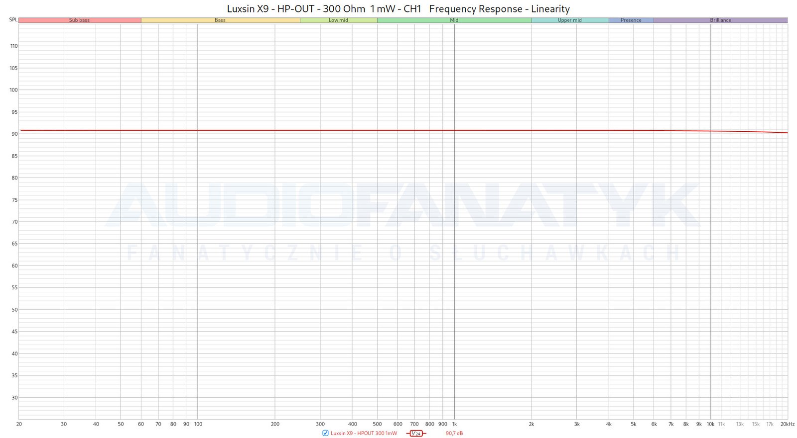 W efekcie spędzałem nad Luxsinem X9 z doskoku praktycznie 1,5 miesiąca, cały czas dopracowując temat jego jak najpełniejszego opisania. Poniżej uzyskanie wyniki dla wyjścia single-ended. Dla wyjścia XLR wyniki dla 300 Ohm na 1 mW i 8 mW były identyczne. Pomiar przy maksymalnej głośności via XLR (10 Vrms!) był już bez sensu (chyba, że ktoś chce pytać astronautów na ISS, czy przypadkiem nie widzieli przelatujących obok nich słuchawek).