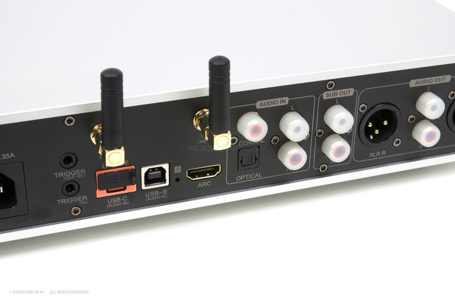 Producent deklaruje, że otrzymujemy tu w pełni zbalansowany tor – tj. od wejścia do wyjścia. Rolę przetworników C/A pełni zespół AKM AK4499EX + AK4191EQ. Akompaniuje im klasyczny XMOS XU316. Mamy bowiem tu obsługę sygnału PCM do 768 kHz / 32 bit oraz DSD512.