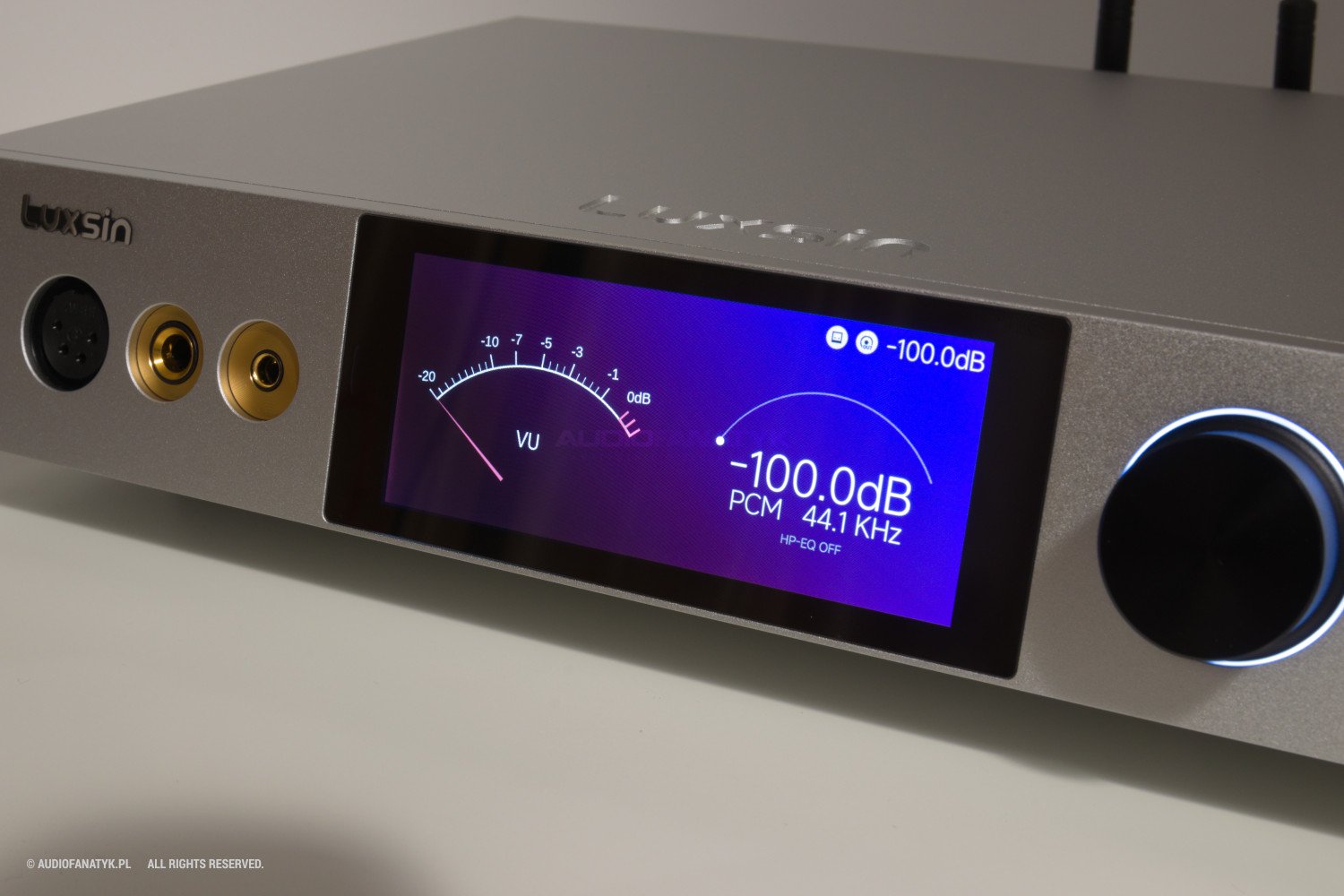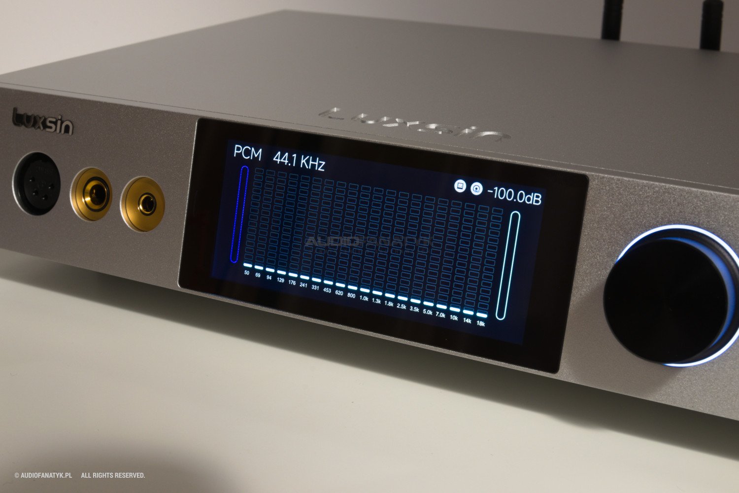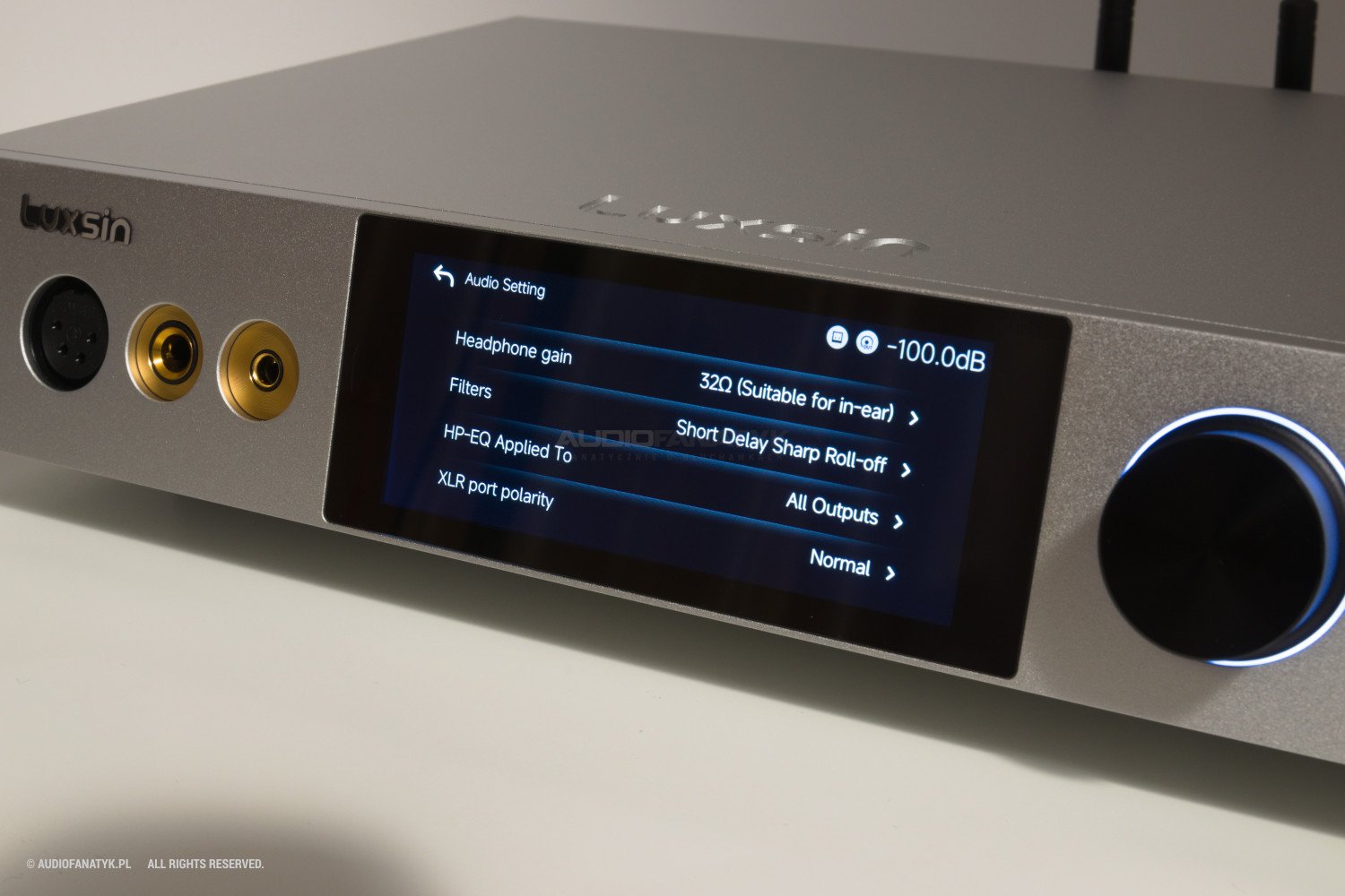 Jak mówi nam karta produktu, Luxsin X9 to w pełni zbalansowany DAC, wzmacniacz słuchawkowy i przedwzmacniacz. To nie wszystko. Mamy tu Wi‑Fi, Bluetooth, HP‑EQ dla krzywej Harmana, automatyczną detekcję impedancji słuchawek, zaawansowany cyfrowy crossfeed oraz systemy RTOS i DNF. Jeszcze mało? Doliczmy 4” ekran dotykowy 1080p w pełnym kolorze i 60+ FPS, wizualizacje do wyboru, pilot, HDMI ARC, aktualizowany firmware czy aplikację mobilną / internetową. Naturalnie mamy też możliwość skonfigurowania własnych efektów i korekcji. Też super opcja.