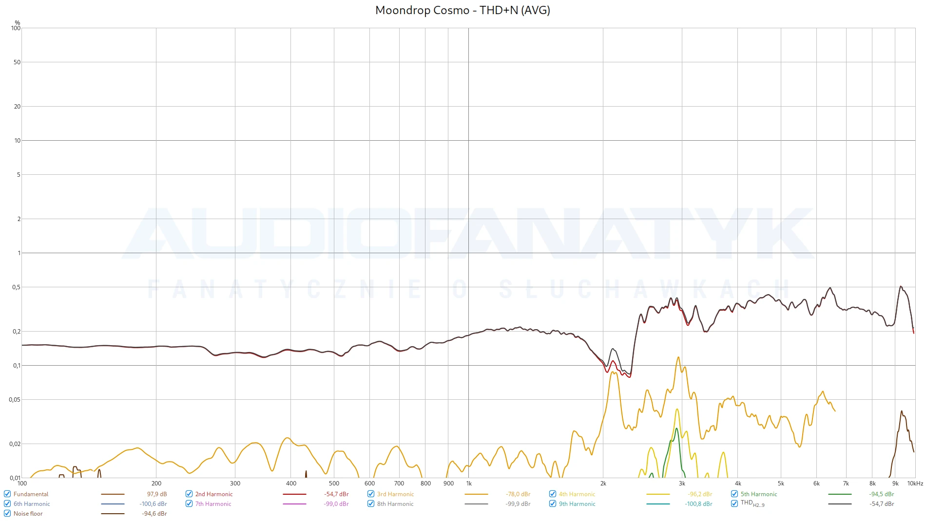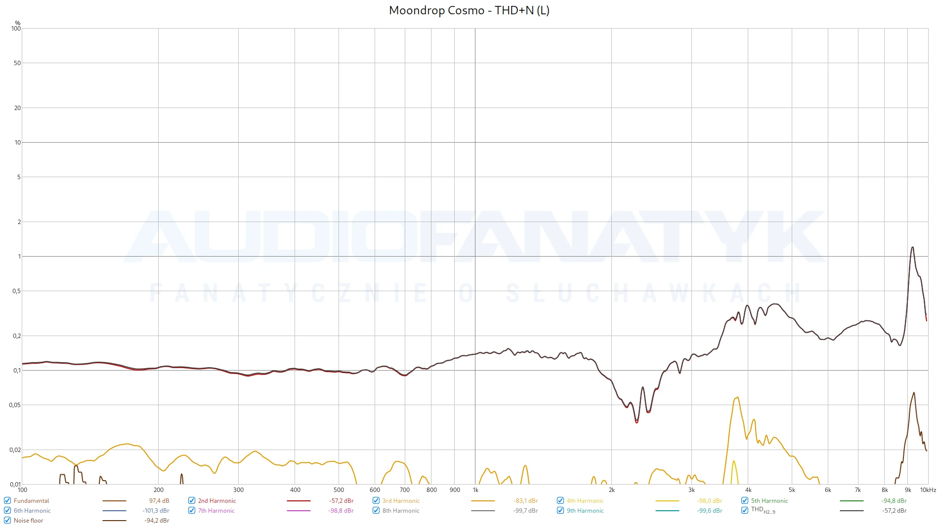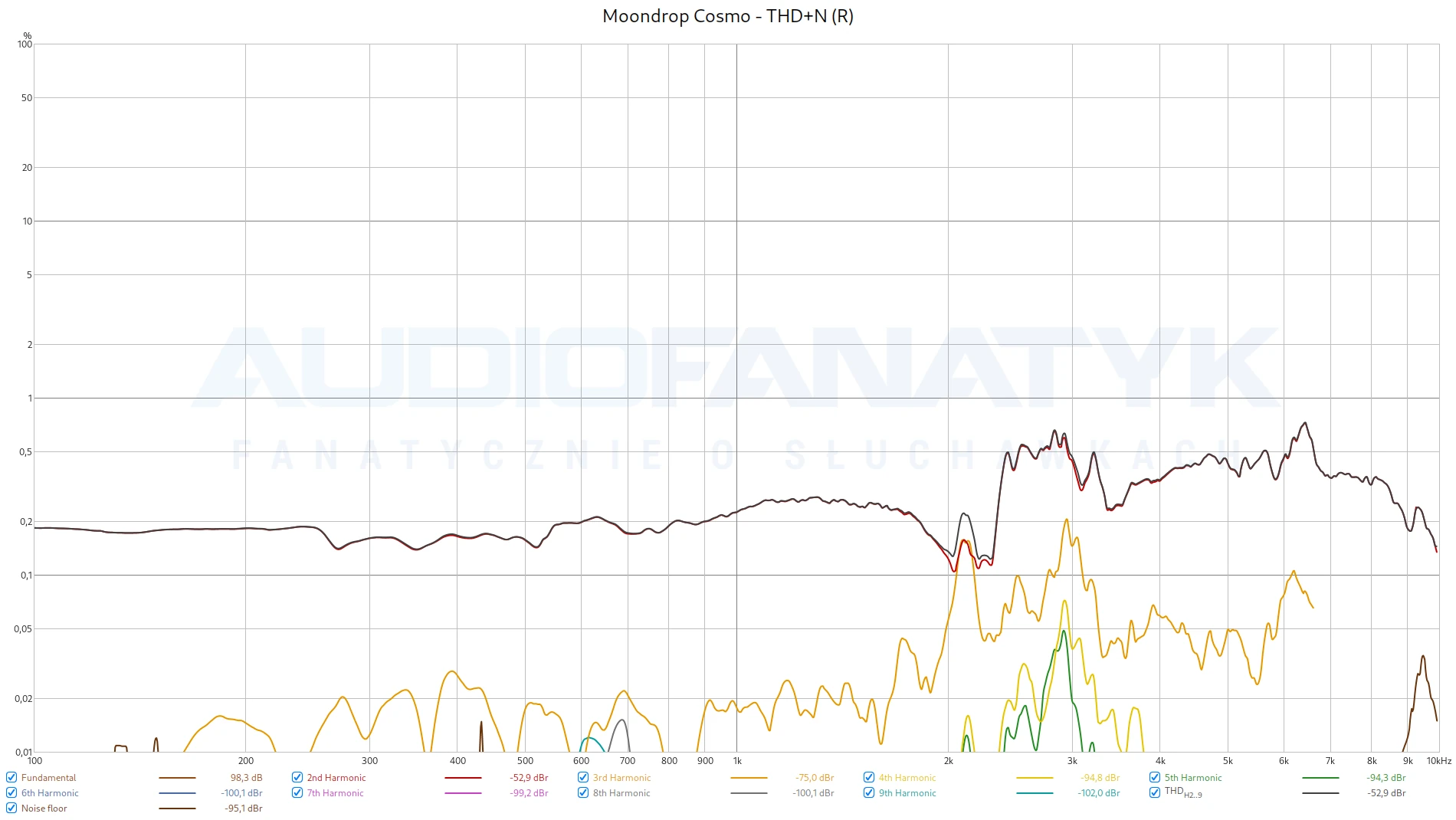 Tonalnie potwierdził się bardzo równy bas, a także naddatek na środku. Można powiedzieć – typowy planar. Widać to też na pomiarach THD, gdzie słuchawki osiągnęły całkiem przyzwoite -54 dB THD+N. Problemem jest jednak nierównomierność zniekształceń. Coś dzieje się z prawym przetwornikiem, który odnotowuje zupełnie inny przebieg oraz gorsze harmoniczne. Nadal trzyma się to dobrego standardu, ale taki widok nie jest dla mnie zaskoczeniem. To typowe zachowanie tanich planarów, wielokrotnie obserwowane przeze mnie u Hifimana czy innych konstrukcji z tamtego rejonu. Rzecz najważniejsza jednak – nigdy nie wyskakujemy powyżej 1%. A więc jest dobrze.