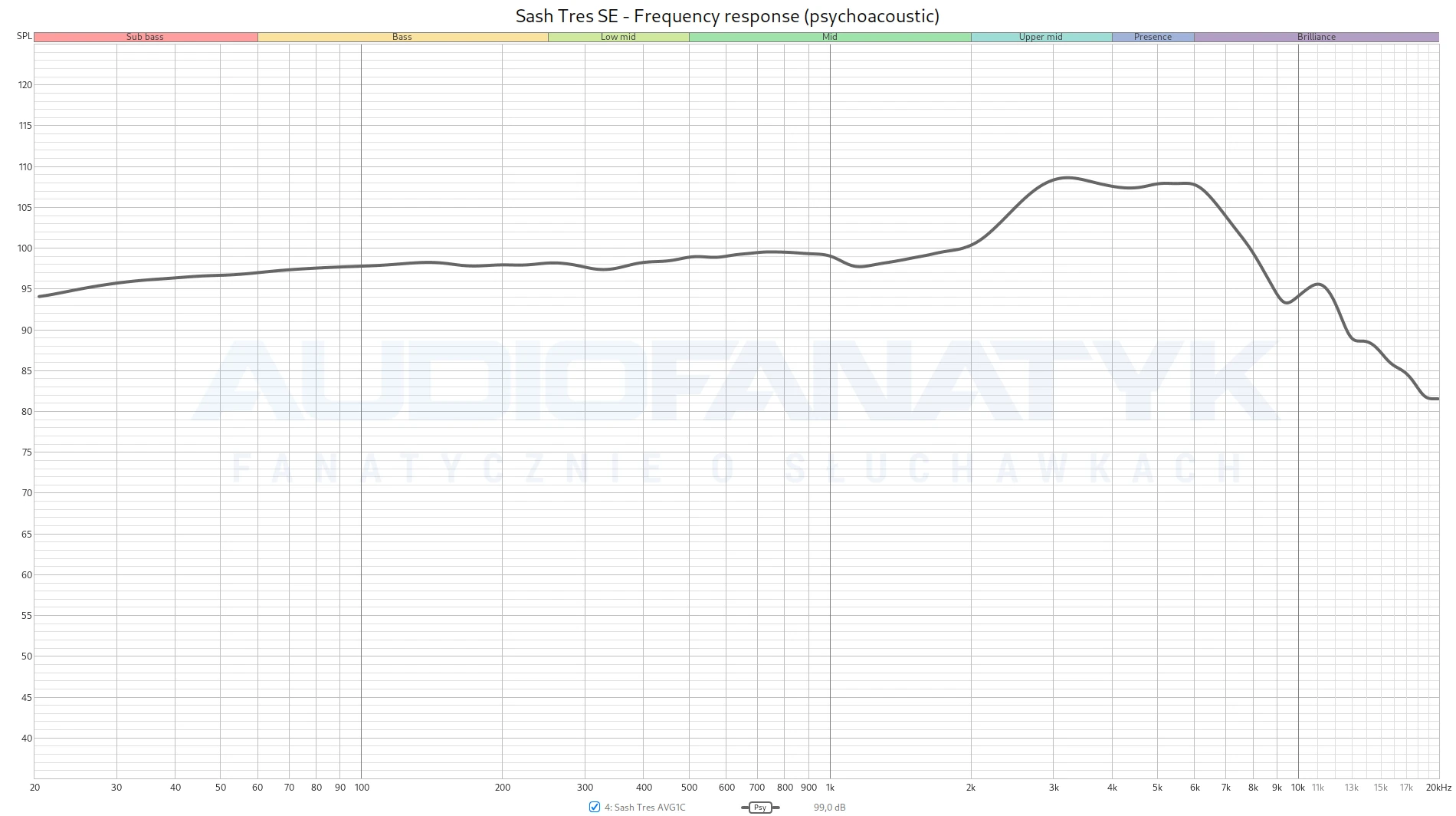 Patrząc na Sash Tres SE przez pryzmat psychoakustyki, projektant tych słuchawek uderzył w bardzo czuły punkt. Nasz słuch jest szczególnie wrażliwy na zakres 2-5 kHz (tzw. wzmocnienie małżowiny usznej). Podkreślenie tego zakresu w Sash sprawia, że odbieramy dźwięk jako bardzo klarowny i „obecny”. Jednocześnie słuchawki nie wzmacniają się zbyt mocno ponad wszystko to, co już zyskujemy od kanału i małżowiny usznej.