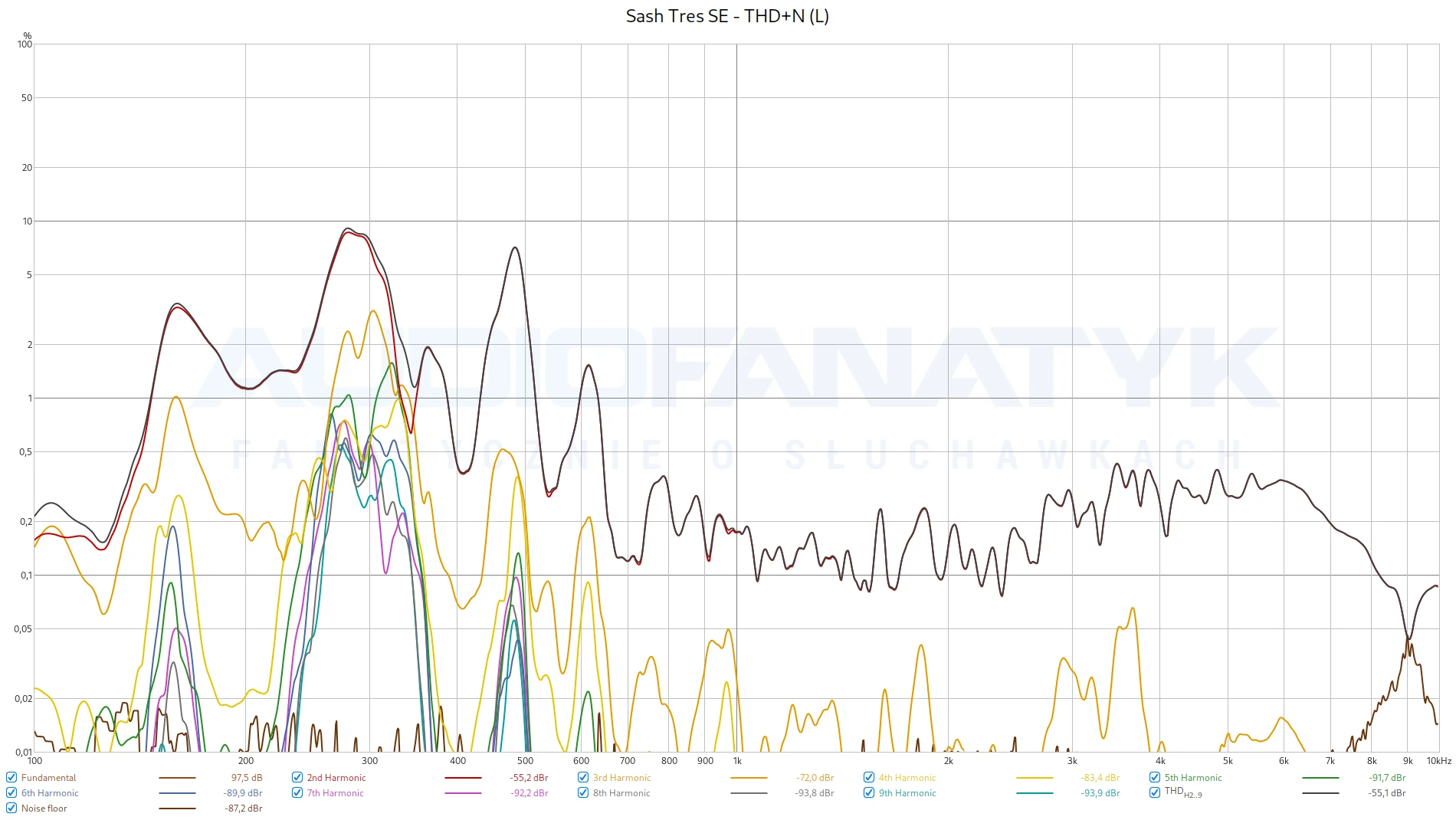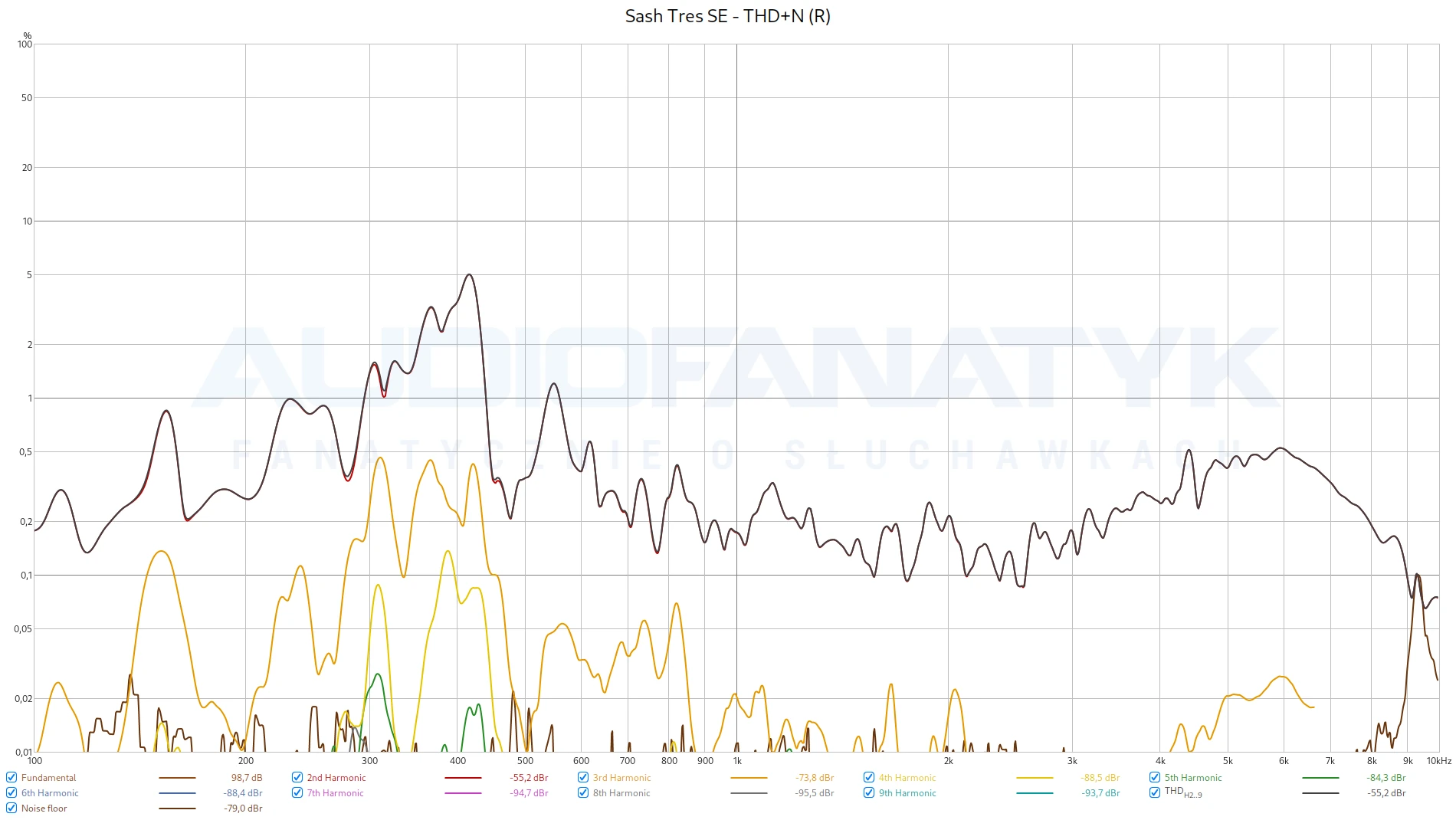 Moje pomiary, przy standardowych 94-95 dB SPL, ujawniły niepokojące wyniki w zakresie zniekształceń harmonicznych (THD+N).