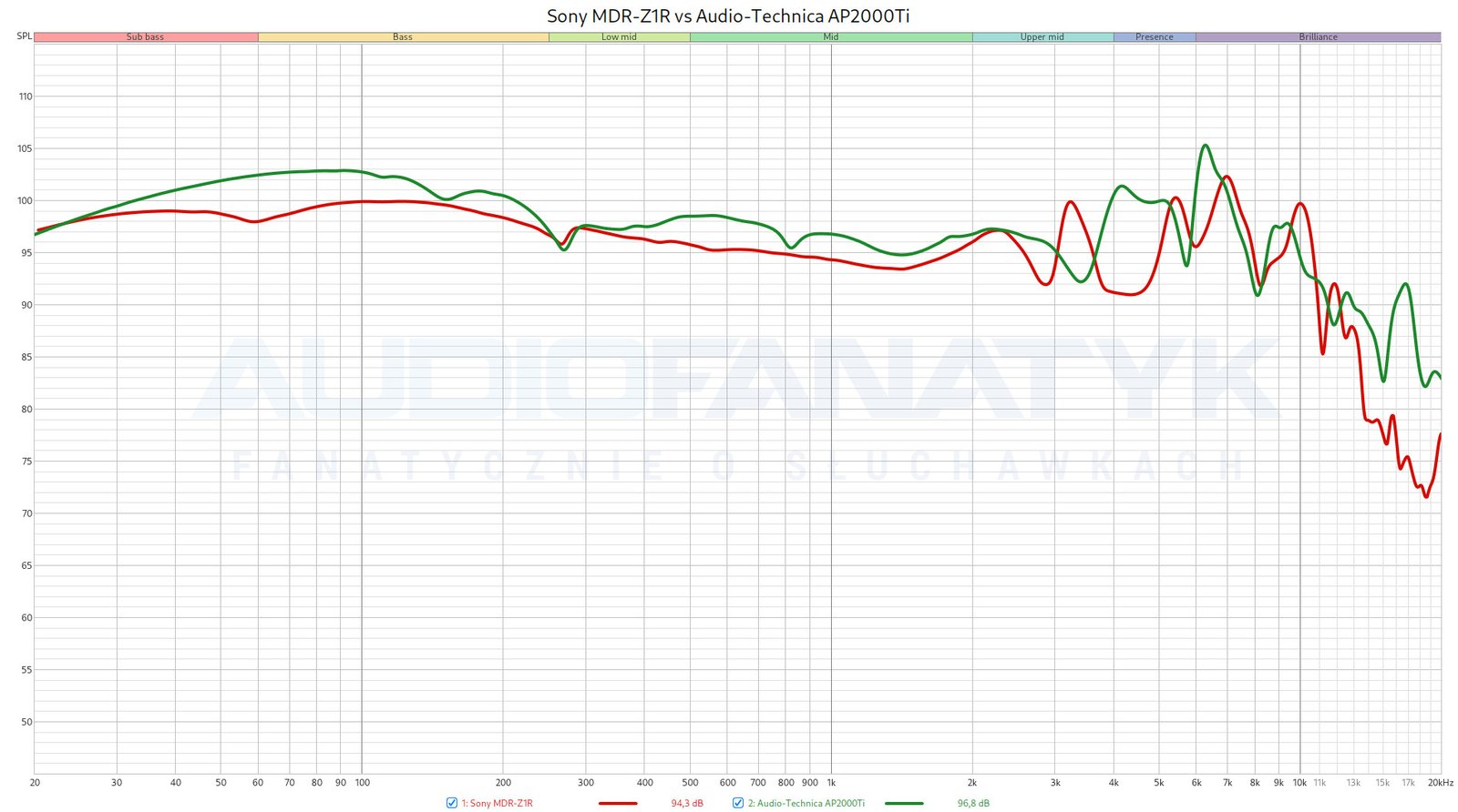 Z tym że Sony są modelem zamkniętym, a Dharmy otwartym, więc prawdopodobnie bliżej im byłoby do AP2000Ti, choć też nie do końca. Audio-Techniki miały jak pamiętam brzmienie bardziej wyrównane na sopranie, głównie w odsłuchu (psychoakustycznie). Zarówno one, jak i Sony, są dosyć nierówne tonalnie, gdzie przewagą AP2000Ti jest inaczej akcentowany nacisk w zakresie wybić. Choć i to mało powiedziane. AP2000Ti to kompletna antyteza dla MDR-Z1R, przeciwieństwo względem sopranu Sony jest aż rażące. W materiałach na końcu recenzji załączam pomiar porównawczy, abyście sami mogli zobaczyć co się tam dzieje.