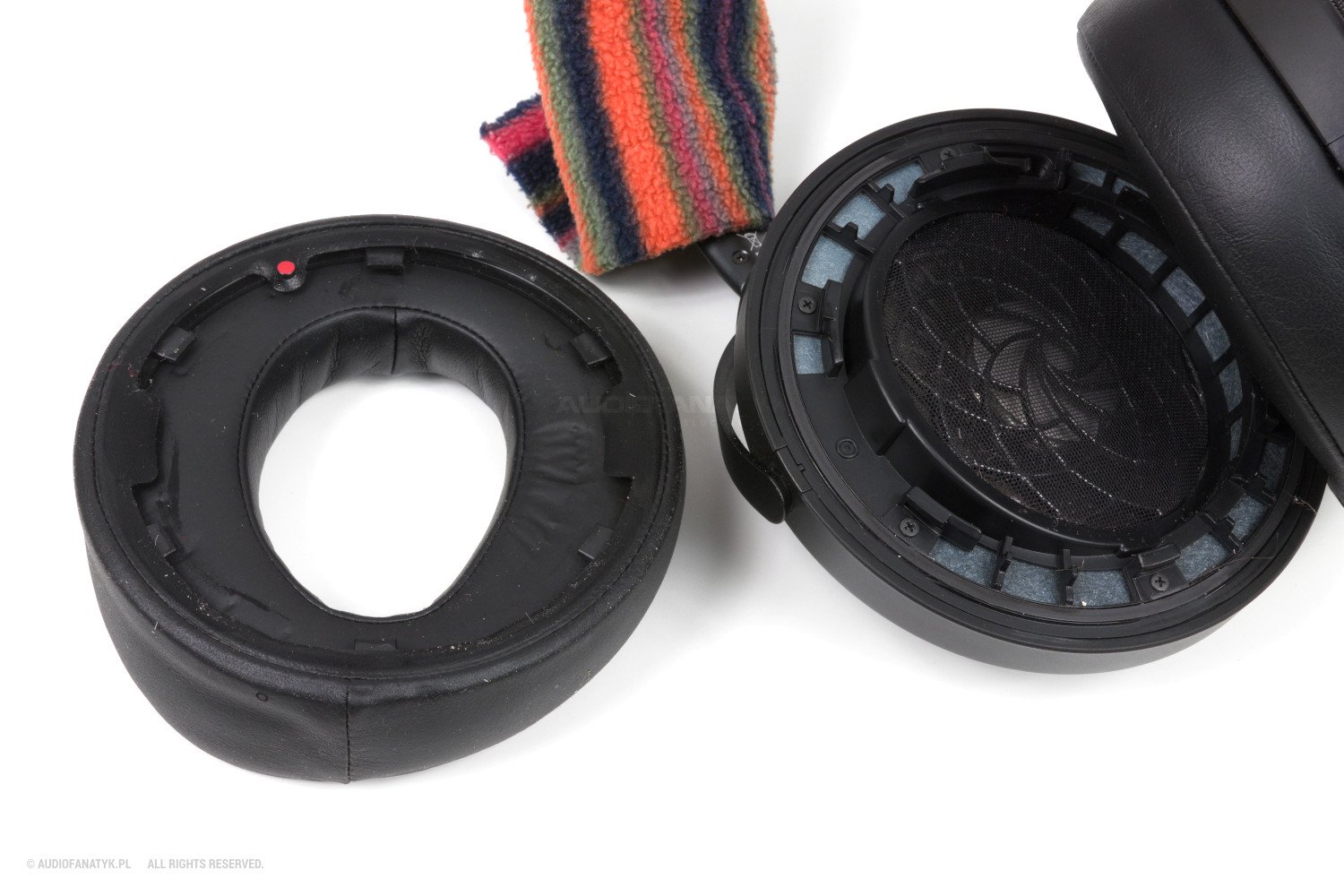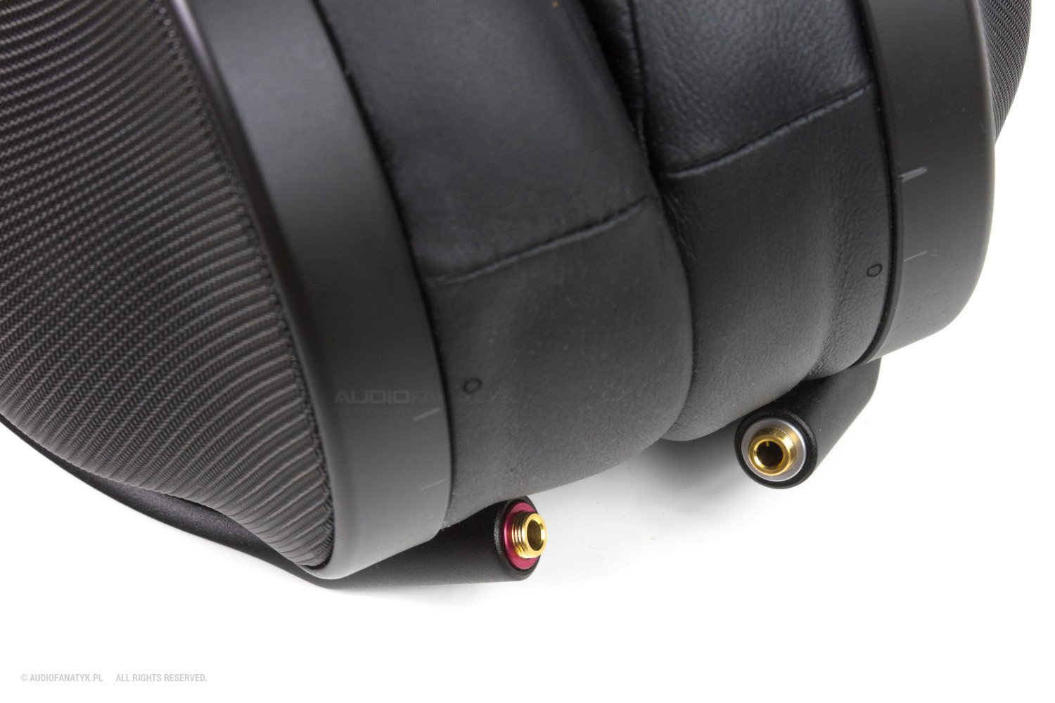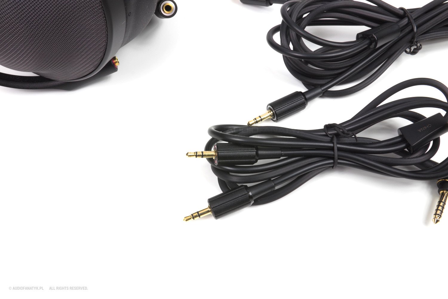 Dedykowane kable mamy dwa – dłuższy single-ended z gwintowaną nasadką oraz krótszy 4,4 mm pod balans. Wtyki są blokowane (nakręcana obudowa), tak samo pady – zakręcane na zatrzaski. Największe wrażenie robią za to przetworniki o ogromnej powierzchni, będące dynamiczną hybrydą polimer + celuloza.