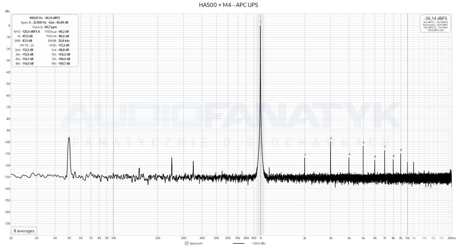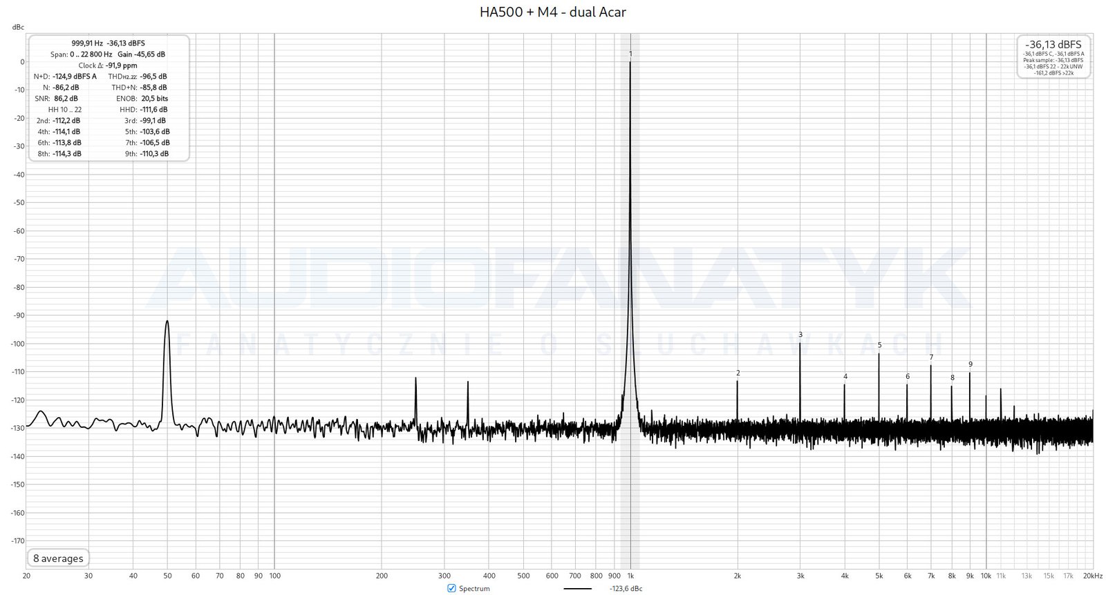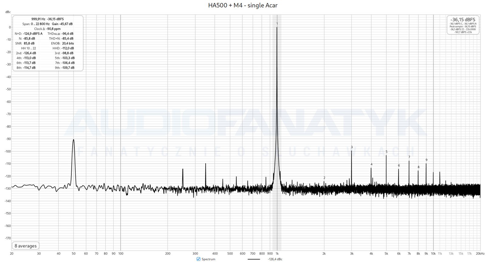 Polepszeniu uległy też ogólne parametry THD+N. Wzmacniacz uzyskał o 0,3 dB lepszy wynik niż w przypadku sytuacji wyjściowej (zmiana z -85,4 dB na -85,7 dB). Również jest to wartość w pełni powtarzalna. Dodatkowo, w HA500 znikają widoczne „śmieci” wokół wyższych harmonicznych. Sugeruje to, że filtr EMI, choć działający w innym zakresie wg specyfikacji, mógł się troszkę jednak do tego przyczynić.
