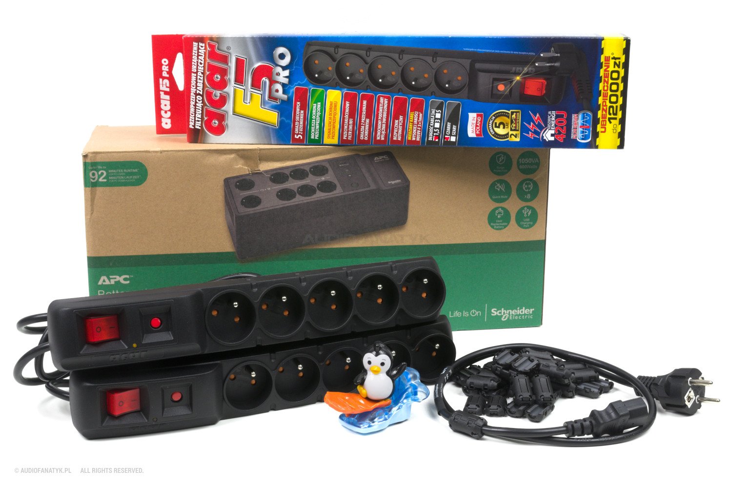 Mimo że APC nie ma ciężkiego transformatora, prawdopodobnie posiada on na wejściu i wyjściu rozbudowane układy filtracji oparte na dławikach ferrytowych i kondensatorach klasy X/Y. Czyli praktycznie to samo, co w listwach Acar, ale zauważalnie skuteczniejsze. Listwa Acar to w dużej mierze tylko zabezpieczenie przeciwprzepięciowe oparte na warystorach. Zdolność do filtrowania zakłóceń wysokiej częstotliwości i syfu z sieci jest tu naturalnie mniejsza, niż w porównaniu do elektroniki APC.
