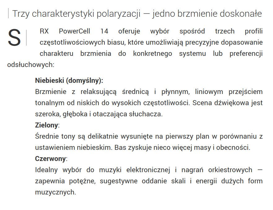 PowerCell 14 zdołał przenieść większość odtwarzanej muzyki wprost do mojego pokoju, czyniąc ją namacalną, bliską, żywą. (…) Gdy wszystkie te elementy współdziałają harmonijnie, dźwięk nie tylko wyłania się zza linii głośników, lecz niemal dotyka moich uszu nieprzerwaną iluzją obecności i autentyczności.