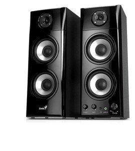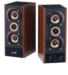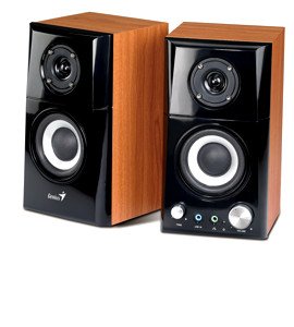 Opis: Klasyczna propozycja 2.0 od Geniusa o stosunkowo małych wymiarach i atrakcyjnej cenie, otwierające zestawienie zestawów stereofonicznych. Te małe głośniczki wbrew wielu opisom nie są wykonane z drewna, tylko zwykłej płyty MDF, ale dzięki temu w tej cenie jest to jeden z opłacalniejszych wyborów ponad kiepskimi, plastikowymi konstrukcjami konkurencji. Dźwięk, jak na tę półkę cenową, jest zadowalający, mimo ich relatywnie niskiej mocy. Regulacja barwy oraz pokrętło głośności wraz z gniazdem liniowym znajdują się na przednim panelu jednej z kolumienek. Sprawdzą się przede wszystkim jako tanie ale estetyczne głośniczki biurkowe dla mało wymagających, ale ceniących sobie zachowanie podstawowych właściwości akustycznych.