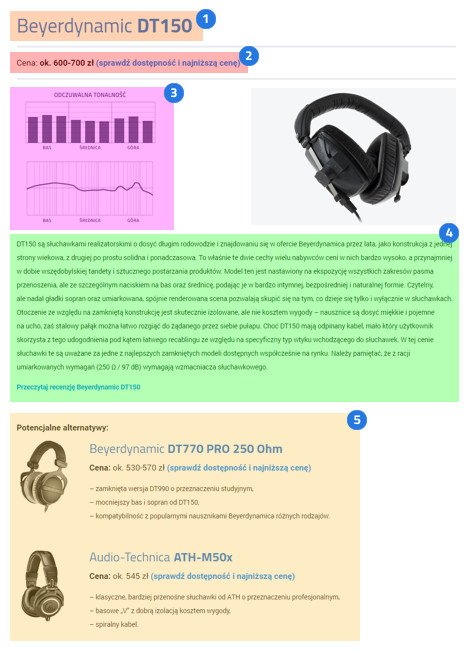 (4) Opis. Zawiera moją opinię i uzasadnienie na temat tego, dlaczego słuchawki trafiły do zestawienia, jakie są ich mocne i słabe strony, kiedy należy brać je pod uwagę podczas zakupów. Większość pozycji posiada dodatkowe linki prowadzące do całych recenzji.
